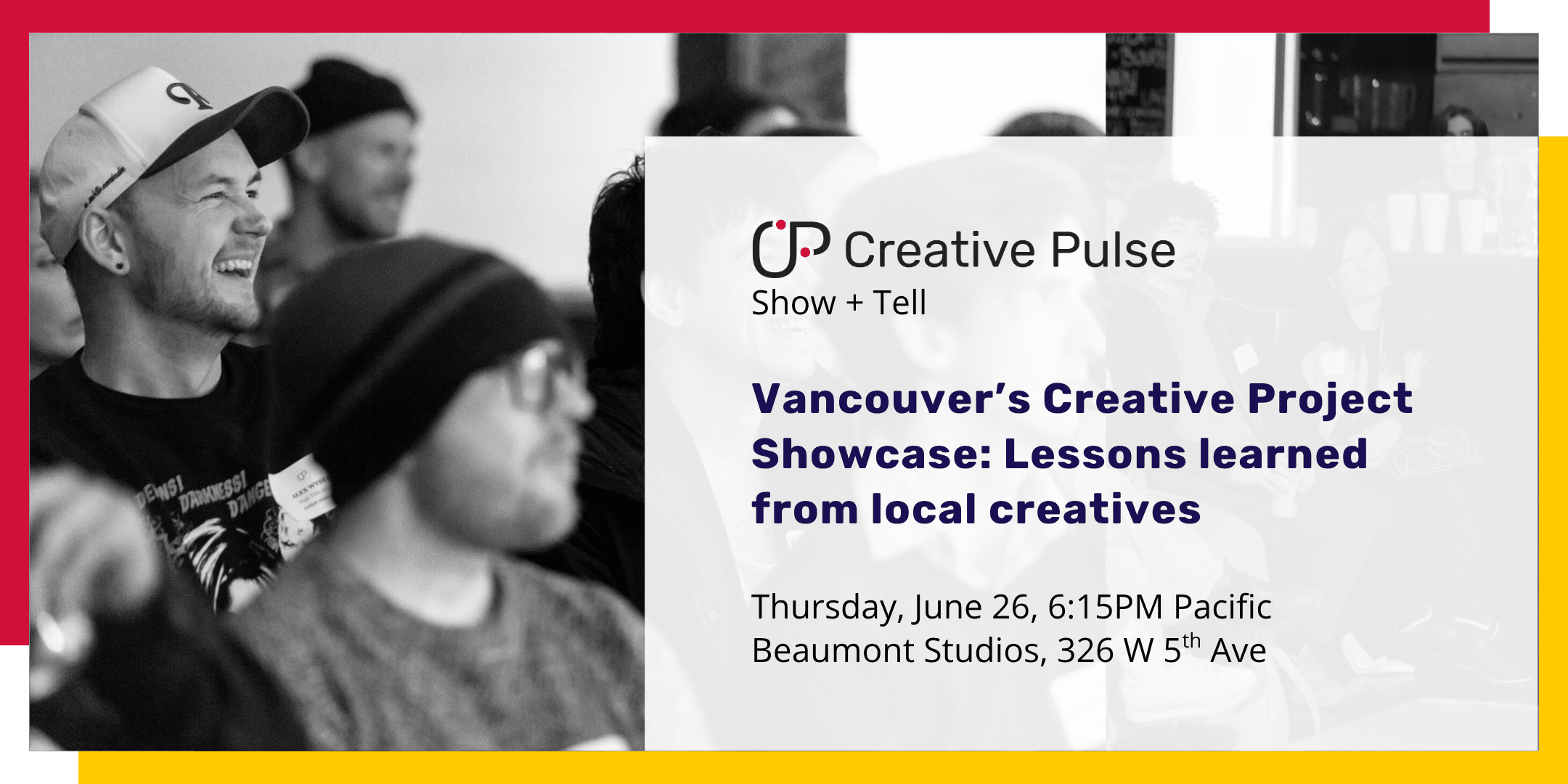 Vancouver’s Creative Project Showcase: Lessons learned from local creatives Jun 26 Vancouver’s Creative Project Showcase: Lessons learned from local creatives 6:16 pm - 9:15 pm